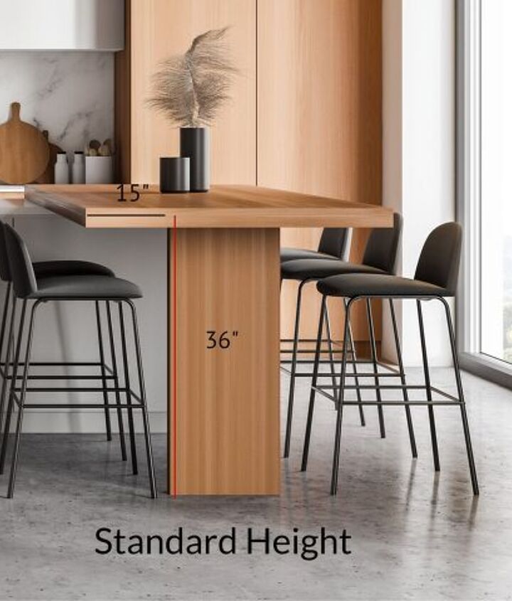 Typically, breakfast bars are 42 inches tall, but there are 30 and 36-inch tall options. The bartop should be 24 inches deep. If you have bar stools, leave at least 3 feet of space behind the stools.
